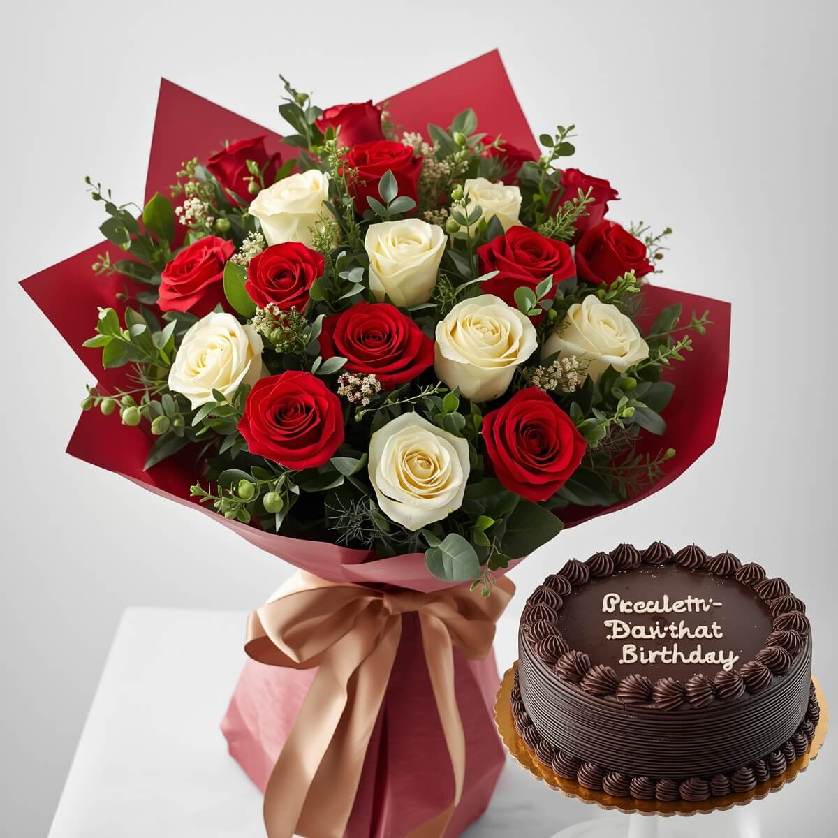 Fresh red & white roses paired with a rich chocolate cake — perfect for birthdays and quick surprises.