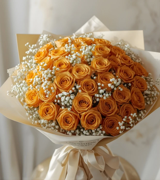 The Golden Roses Anniversary Bouquet is an elegant and luxurious arrangement of golden roses, symbolizing eternal love, prestige, and celebration. This sophisticated bouquet is perfect for marking a milestone in your relationship, offering a rare and precious tribute to love.