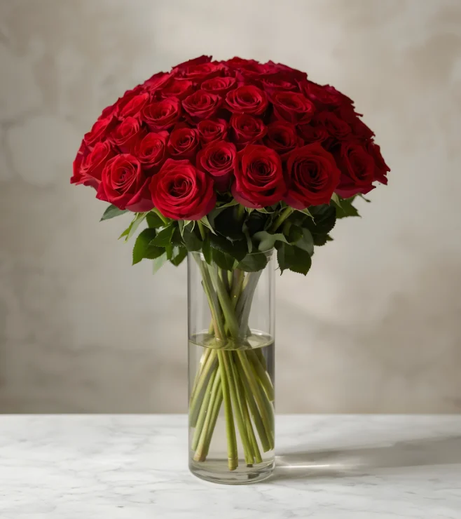Make a bold romantic statement with these deep red I Love You Roses. Set in a tall glass vase, they symbolize eternal love and admiration. The perfect surprise to win any heart over.