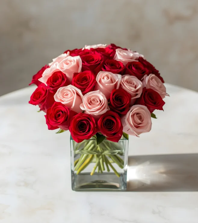 LoveLight Open Roses blend blush pink and red tones in a modern square vase. Ideal for expressing love, friendship, or joy with elegance. A balanced bouquet for heartfelt gifting.